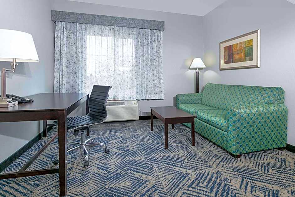 This room features a sitting area with sofa bed and cable TV. A microwave and refrigerator are also included.